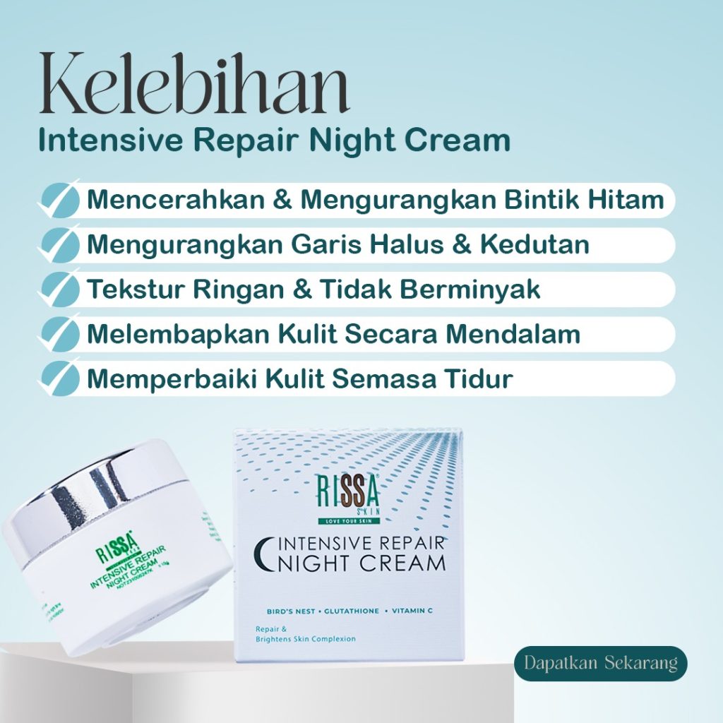 Rissa Skin Intensive Repair Night Cream bukan sekadar krim malam biasa. Ia diformulasikan dengan bahan-bahan berkualiti tinggi yang terbukti berkesan untuk mencerahkan, melembapkan, dan memperbaiki kulit.